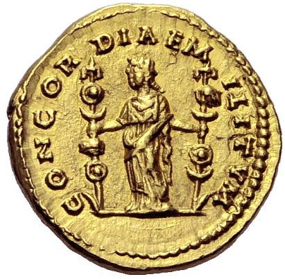 Rub (Revers): Personifikace věrnosti Fides stojící čelně, s hlavou otočenou doleva. V rukou drží dvě vojenské standarty. Opis CONCORDIAE MILITVM (Svornost vojsk) není náhodný – Septimius Severus si byl dobře vědom, že jeho trůn stojí na loajalitě jeho legionářů.